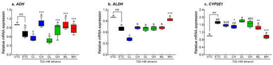 Effects of Cys, GSH, and MIX treatment on alcohol metabolism-related mRNA expression in ethanol-treated HepG2 cells. HepG2 cells were treated with Cys, GSH, and MIX with 700 mM ethanol for 24 h. UTC: untreated cells, ETC: ethanol-treated cells, CL: 1.0 mM Cys treated cells, CH: 2.5 mM Cys treated cells, GL: 1.0 mM GSH treated cells, GH: 2.5 mM GSH treated cells, ML: 1.0 mM MIX treated cells, MH: 2.5 mM MIX treated cells. Values are mean ± SD. Different letters indicate significant differences at the p < 0.05 level (ANOVA followed by Tukey’s test). ††† p < 0.001 vs. NOR group; * p < 0.05, ** p < 0.01 and *** p < 0.001 vs. ETC. Cys, cysteine; GSH, glutathione; MIX, the mixture of cysteine and glutathione in a 3:1 ratio; ADH, alcohol dehydrogenase; ALDH, aldehyde dehydrogenase; CYP2E1, cytochrome P450 family 2 subfamily E member 1.