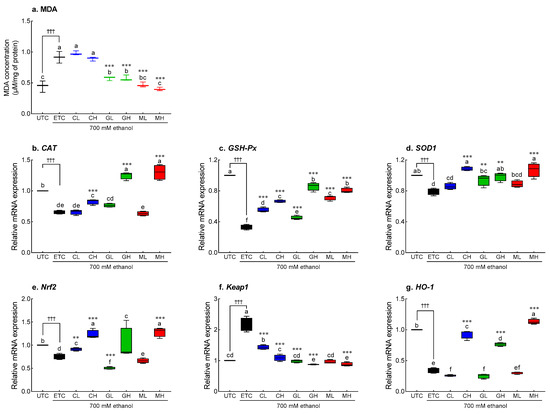 Ethanol treatment increased MDA accumulation 2.5 times (p < 0.001), whereas GSH and MIX treatment significantly inhibited MDA production (p < 0.001, Figure 7a). In addition, ethanol treatment significantly decreased mRNA expression of antioxidant enzymes including CAT (0.65-fold; Figure 7b), GSH-Px (0.33-fold, Figure 7c), and SOD-1 (0.79-fold, Figure 7d) compared to UTC (p < 0.001). High-dose Cys, GSH, and MIX treatment significantly increased the mRNA expression of CAT (p < 0.01 and p < 0.001, respectively) and SOD-1 (p < 0.01 and p < 0.001, respectively) compared to the ETC. The expression of GSH-Px increased in a dose-dependent manner following Cys, GSH, and MIX treatment (p < 0.001). Ethanol significantly suppressed the expression of Nrf2 (p < 0.001, Figure 7e) and HO-1 (p < 0.001, Figure 7g) more than UTC, but increased the expression of Keap1 (Figure 7f, p < 0.001).