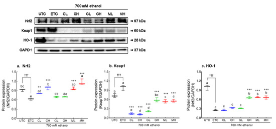 Similarly, MIX treatment significantly restored the protein expression of Nrf2 (p < 0.001, Figure 8a) and HO-1 (p < 0.001, Figure 8c) that had been reduced by ethanol. Cys-treated groups had significantly higher Nrf2 protein expression than the ETC group in a dose-dependent manner (p < 0.01 and p < 0.001, respectively). Treatment with 2.5 mM GSH significantly increased HO-1 protein expression (p < 0.001). In addition, the Cys-treated, GSH-treated, and MIX-treated groups showed significantly lower Keap1 protein expression than that in the ETC (p < 0.001, Figure 8b).
