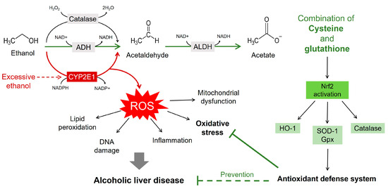 Persistent and excessive alcohol consumption promotes the microsomal ethanol oxidation system rather than the dehydrogenase pathway. During this process, instead of ADH, cytochrome P450 2E1 (CYP2E1) is activated in the liver to break down acetaldehyde [6]. Ethanol metabolism by CYP2E1 generates excess reactive oxygen species (ROS) and depletes glutathione (GSH) in hepatocytes. GSH is an antioxidant that plays an important role in ROS scavenging and is present at high levels in mammalian cells. Depletion of GSH is commonly observed in chronic alcohol consumption and liver diseases involving oxidative stress [7]. Large amounts of ROS are generated by the activation of CYP2E1, which damages DNA, proteins, and lipids and accumulates lipid peroxides. The risk of alcoholic liver disease by inducing proinflammatory cytokine production and apoptosis is also increased [8]. Consequently, chronic alcohol consumption is a major contributor to oxidative stress, which not only promotes ROS production but also disrupts the redox system homeostasis of the body.