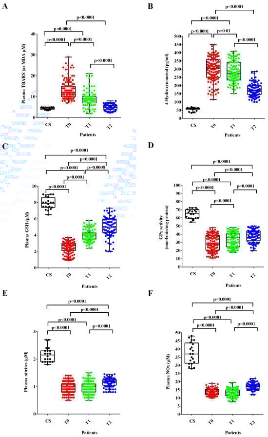 Regarding NO evaluated as nitrites and NOx, the plasma levels were significantly lower at T0 and T1 than those measured in healthy controls. Despite the improvement observed at T2, however, they continued to be very low even 6 months after the start of ALCAR treatment (T2; Figure 2E,F).