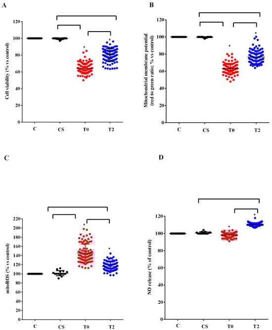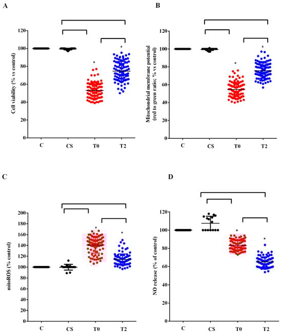 Effects of plasma of ALS patients and healthy controls (CS) on cell viability (A), mitochondrial membrane potential (B), mitochondrial reactive oxygen species (mitoROS) release (C), nitric oxide release (NO), (D) in human umbilical cord-derived endothelial vascular cells (HUVEC). T0: recruitment; T2: after six months of Acetyl-L-Carnitine (ALCAR) treatment. Square brackets indicate significance between groups as p-value < 0.05. * indicates p-value < 0.05 vs. C.