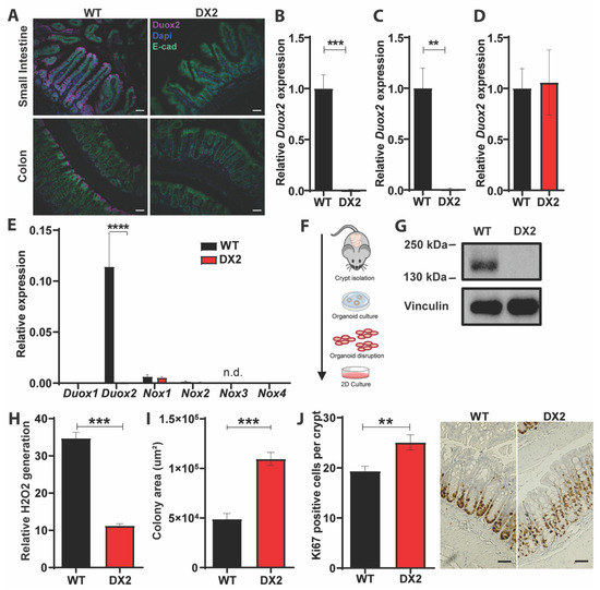 To determine the role of epithelial DUOX2 for intestinal homeostasis, host-microbiome interactions, and inflammatory responses, we generated Duox2fl/fl-Villin::Cre+ mice lacking DUOX2 specifically in IEC, hereinafter referred to as Duox2∆IEC or “DX2” mice. The Duox2 gene was targeted by flanking exons 7–10 with loxP sites (Figure S2A), which are deleted by CRE recombinase yielding transcript encoding a non-functional DUOX2 protein. We used littermate Duox2fl/fl mice, hereinafter referred to as WT mice, as controls. Successful conditional deletion of DUOX2 only in IECs was confirmed using three approaches. (i) Using immunofluorescence microscopy on intestinal sections, we found that in WT mice, the DUOX2 protein is predominantly present in differentiated enterocytes of the apical epithelium and to a lesser extent in epithelial cells of the crypt and lower villus (Figure 1A). In Duox2∆IEC mice, no DUOX2 protein could be detected in IECs, but only very low levels were detectable in non-epithelial cells of the interstitium or submucosa. (ii) Using qPCR, we demonstrated that Duox2 expression was robustly reduced in the small intestine and colon of Duox2∆IEC mice compared to WT littermate controls, whereas Duox2 expression was unaltered in the liver due to tissue specificity of the Villin::Cre system (Figure 1B–D). We also isolated small intestinal IECs and surveyed expressions of all NOX family members to check for the Duox2 deletion and test for compensatory effects on other ROS-producing NOX enzymes. In isolated IECs, we could not detect any Duox2 expression, and no other NOX gene displayed any upregulation (Figure 1E). We could only detect low expression levels of Nox1 and Nox2 (18× and 72× lower than Duox2) and even lower levels for Duox1 and Nox4 (4013× and 22,595× lower than Duox2), whereas Nox3 was not expressed at all by IECs. (iii) Using Western blot, we detected the DUOX2 protein in lysates of intestinal epithelial organoids derived from WT but not from Duox2∆IEC mice (Figure 1G). Unchallenged Duox2∆IEC mice were analyzed for their physiological phenotype. Duox2∆IEC mice appeared healthy and showed no growth impairments or other aberrant macromorphological features. Body weight, relative weight of cecum, liver, and spleen, or length of the small and large intestine did not differ between Duox2∆IEC and WT littermate control mice (Figure S2B). Similarly, we did not detect any alterations in the small intestinal or colonic lamina propria immune cells profile (Figure S2C) or any histological changes in the intestinal epithelial architecture (Figure S2D). To investigate whether the deletion of DUOX2 impacts epithelial ROS production, we measured ROS production by intestinal organoids, and ROS production was drastically reduced in DUOX2-deficient organoids (Figure 1H). High levels of ROS can be toxic to IECs, and we therefore measured the proliferative capability of intestinal organoids. DUOX2-deficient intestinal organoids grew faster than WT organoids (Figure 1I). Since we noted high DUOX2 levels, specifically in the apical epithelium and crypt (Figure 1A), we investigated whether cell death (apical) or proliferation (crypt) was altered in Duox2∆IEC mice. Deletion of epithelial DUOX2 did not impact apoptosis, but higher numbers of proliferative (Ki67+) IECs were detected in the crypts of Duox2∆IEC compared to WT mice (Figure 1J). The increased proliferation did not result in changes in epithelial architecture, i.e., villus length or crypt depth (Figure S2D). In summary, these data suggest that ablation of epithelial DUOX2 does not induce obvious systemic physiological alterations but stimulates intestinal epithelial proliferation.