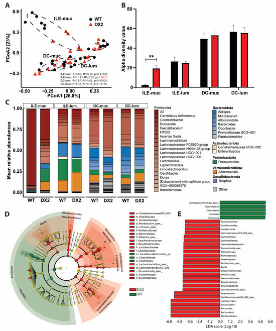 MiSeq 16S amplicon sequence data were processed using DADA2 [26] workflow (https://benjjneb.github.io/dada2/bigdata.html accessed on 25 October 2022) with default parameters resulting in abundance tables of amplicon sequence variants (ASVs). Taxonomy was assigned using the Bayesian classifier provided in DADA2 and using the Silva rRNA database v.138 [27]. Samples with >5000 reads were retained for analyses. Uni- and multivariate analyses of the 16S data were conducted in the R statistical software (v.4.2.1) under phyloseq [28] (v.1.40.0), vegan [29] (v.2.6-2) and MAasLin2 [30] (v.1.10.0). All samples for diversity analyses were normalized by rarefaction to the minimum shared read count to account for differential sequencing depth among samples. Relative abundance was calculated by dividing the number of reads for an ASV by the total number of sequences in the sample. Alpha diversity measures and beta diversity were computed using Bray–Curtis, and differences were visualized in a principal coordinate analysis plot. Constraint analysis of principal coordinates was computed on the DSS experiment data based on Aitchison distances. Associations of microbiome composition to specified covariates were tested with the implementation of PERMANOVA models (using the adonis2 function from the vegan package). The P and R2 values were determined by 10,000 permutations. Linear discriminant analysis (LDA) effect size (LEfSe) [28] was performed using the online tool available at http://huttenhower.sph.harvard.edu/galaxy accessed between 1 October 2022 and 1 December 2022. LDA denotes taxa based on their contribution to the overall observed differences between groups, i.e., taxa being significantly increased in abundance. To detect differences in changes in microbial features between WT and DX2 over time or among mucosal or luminal small intestine or colon tissue, we built linear mixed models using the MaAslin2 package [30] in previously wrench normalized abundances [31]. The model included time and/or genotype group and individual mice as a random variable. p values were corrected for multiple hypothesis testing using the Benjamin-Hochberg procedure, and a false discovery rate < 0.05 was defined as the significant threshold. Only features appearing in at least 20% of the samples were included in the analysis.