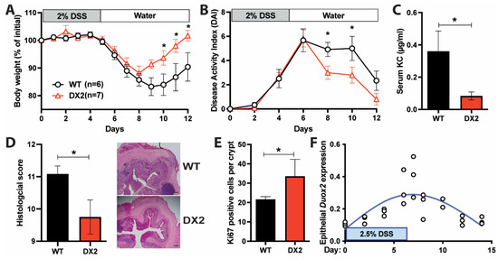 Loss of DUOX2 in the intestinal epithelium protects from colitis. (A) Body weight loss of WT and Duox2∆IEC mice during DSS-induced colitis (WT n = 6, DX2 n = 7). (B) Disease activity index (DAI) consists of stool consistency, fecal blood occurrence, and body weight loss (WT n = 6, DX2 n = 7). (C) Serum KC/CXCL1 (pro-inflammatory cytokine) levels as determined by ELISA (WT n = 6, DX2 n = 7). (D) Histological score of H&E-stained colon sections, including representative images. The scale bar represents 50 µm (WT n = 6, DX2 n = 7). (E) Increased epithelial proliferation in Duox2∆IEC compared to WT mice after challenge with DSS as measured by Ki-67+ cells per colon crypt (WT n = 6, DX2 n = 7). (F) Epithelial Duox2 expression follows disease activity during colitis induction and recovery. RNAseq data [34] of WT mice treated with 2.5% DSS for 7 days and additional recovery for 7 days. Duox2 expression was normalized to the epithelial marker gene Cdh1. The trendline is indicated in blue (n = 3). * p < 0.05.