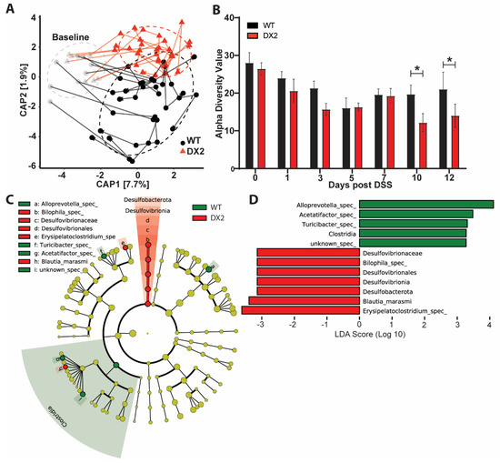 Under inflammatory stress, Duox2∆IEC mice develop an altered fecal microbiome. (A) Constrained analysis of principal coordinates revealed differential developmental transitions in fecal microbiomes of WT and Duox2∆IEC mice during DSS−induced colitis (WT n = 8, DX2 n = 7). (B) Reduced alpha diversity (Inverse Simpson metric) in Duox2∆IEC mice at the late stage of DSS−colitis. (C,D) Lefse analysis of the merged day 7–12 microbiomes. (C) The cladogram depicts the phylogenetic distribution of differential taxa. (D) Differential taxa ranked by LDA. * p < 0.05.