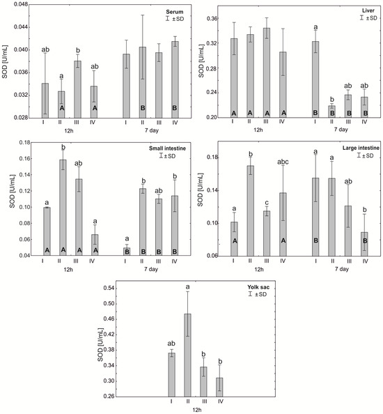 Statistically significant differences were observed in the average superoxide dismutase (SOD) activity in the chicken serum 12 h after hatching between group III and group II. Statistically significant differences in SOD activity between 12 h and 7 days of the study were observed only in groups II and IV. After 7 days of the experiment, statistically significant differences were also observed between groups I and II in the liver cells. After 12 h of the experiment, statistically significant differences were observed in SOD activity in the small intestinal cells in group II compared to groups I and IV. After 7 days, however, statistically significant differences were found in the small intestine between groups III and IV. Statistically significant differences in SOD activity in colon cells after 12 h of the experiment were observed between the control group (I) and groups II and III and between groups II and III. After 7 days, statistically significant differences in SOD activity in the large intestine were observed in group IV compared to groups I and II. The average SOD activity in the yolk sac was statistically significantly different in group II compared to groups III and IV. See Figure 1 and Table S1.