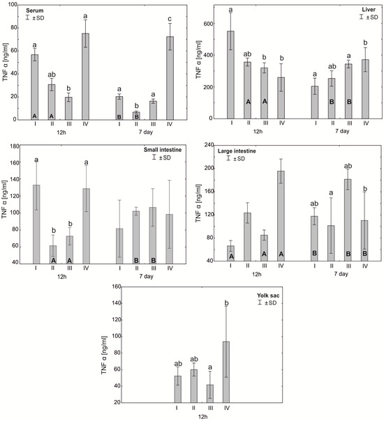 The mean TNF-α concentration in the serum after 12 h of the experiment was statistically significantly different in the control group I and group IV compared to group III. After 7 days of the experiment, the serum concentration of TNF-α showed statistically significant differences in groups I, III and IV compared to group II. The analysis of the TNF-α concentration in the liver after 12 h of the experiment showed statistically significant differences in group I compared to groups III and IV. After 7 days of the experiment, statistically significant differences were found in the concentration of TNF-α in the liver between group IV and groups I and III. In the small intestine, the concentration of TNF-α after 12 h of the experiment differed statistically significantly in groups I and IV compared to groups II and III. The analysis of the concentration of this cytokine in the large intestine after 7 days of the experiment showed statistically significant differences between group II and group III. The concentration of TNF-α in the yolk sac in group III differed statistically significantly from the value obtained in group IV. Depending on the time of sampling, statistically significant differences were observed in the serum TNF-α concentration in groups I and II. The level of this cytokine in the liver in groups II and III also differed statistically significantly after 7 days of the study compared to the values obtained after 12 h. Similarly, the concentration of TNF-α in the small intestine differed statistically significantly in groups II and III compared to the values obtained after 7 days of the experiment. Statistically significant differences in the TNF-α concentration were also observed in the large intestine in groups I, III and IV (Figure 3, Table S1).