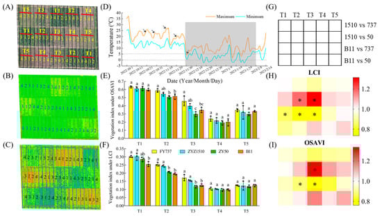 The phenotype of different rapeseed materials under natural cold-stress photographed by unmanned aerial vehicle. (A) Field planting model under UAV imaging; (B,C) aerial hyperspectral image and vegetation index under LCI and OSAVI; (D) variation of temperature in Hangzhou Yuhang district from seeding time to the end of cold. arrows represent the five seeding dates. (E,F) vegetation index obtained from aerial hyperspectral image under LCI and OSAVI. Different letters indicate significant different at p < 0.05; (G–I) vegetation diagram of vegetation index heatmap. 1, FY737; 2, ZYZ1510; 3, ZY50; 4, B11. T1, T2, T3, T4, T5 represented the seeding dates at 20th October, 30th October, 10th November, 20th November and 30th November, respectively. The dash area represents the period that cold-stress occurred. *, represents significant difference, p < 0.05.