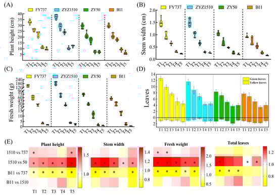 According to the results of the photography and hyperspectral imaging via UAV, we can clearly observe that the growth of the rapeseed was significantly inhibited, as shown by the delay in seeding date with the drop in temperature (Figure 1A–C). FY737-T1 had the highest vegetation index, calculated by using the LCI and OSAVI methods, with values reaching 0.30 and 0.63, respectively, while ZY50-T4 had the lowest indices; the vegetation indices were 0.099 and 0.194 in LCI and OSAVI, respectively, which decreased by 67.0% and 69.2% (Figure 1B,C). However, contrary to our expectations, the vegetation index did not further decrease at T5, but slightly rebounded (Figure 1). Further measurement of agronomic traits revealed that when the seeding date was later than T3, its growth was greatly inhibited compared with earlier dates. The plant height, stem width, fresh weight and leaf numbers of the LST cultivars FY737 and ZYZ1510 were higher than those of the late-seeding-sensitive (LSS) cultivars ZY50 and B11 under all seeding dates, with the first three seeding dates being more significant (Figure 2).