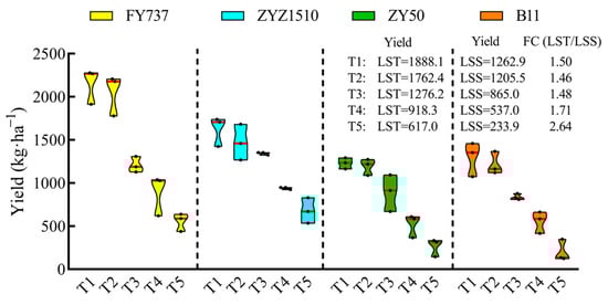 The yield of LST cultivars during the entire late seeding period was higher than that of LSS. With the delay in seeding, the average yield of the LST cultivars decreased from 1888.1 kg·ha−1-T1 to 616.9 kg·ha−1-T5, while the yield of the LSS cultivars decreased from 1262.9 kg·ha−1-T1 to 233.9 kg·ha−1-T5, and the foldchange (LST/LSS) increased from 1.50 to 2.64 times (Figure 3), highlighting the advantages of LST cultivars under complex late seeding conditions.