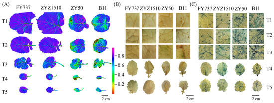 To test if the growth differences were caused by ROS damage, we examined the accumulation levels of H2O2 and O2.- with the DAB and NBT staining methods, respectively. Little brown spots, which represented the deposition of H2O2, were detected in both LST cultivars, except for ZYZ1510 at T5, while the areas were obviously increased in the LSS cultivars at all seeding dates, especially the dates after T3, in accordance with the florescence imaging (Figure 4B). In contrast to the DAB staining, the degrees of staining via NBT were significant, which indicated that all cultivars had suffered obvious damage from O2.−, while the LST cultivars showed a lower accumulation than the LSS cultivars for all seeding dates. Moreover, large areas of staining were detected via NBT in LSS cultivars for all seeding dates, indicating that O2.- might be the main stressor (Figure 4C).