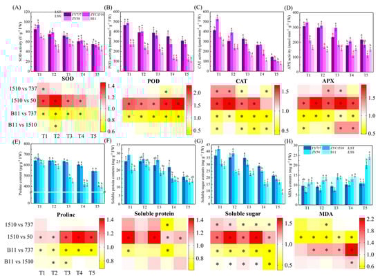 As one of the indicators for identifying the degree of plant cell damage, the MDA content of both LST cultivars was significantly lower than that of the LSS cultivars, except for FY737-T1. It is worth mentioning that the fluctuation in the MDA content was relatively small in the LST cultivars throughout all seeding dates, ranging from 6.7 mg·g−1-T1 to 10.87 mg·g−1-T5 on average. However, the MDA contents were significantly increased in the LSS cultivars as the seeding date was delayed, from an average of 11.15 mg·g−1-T1 to 22.18 mg·g−1-T5, representing an increase of 98.9% (Figure 5H).