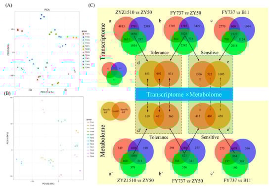 Principal component analysis (PCA) of transcriptomic and metabolomic profile of 4 rapeseed materials with 3 seeding dates, and the identification of candidate late-seeding-tolerant/-sensitive DEGs and DAMs for underlying interaction analysis. (A,B) PCA analysis of transcriptomic and metabolomic profiles; (C) identification of candidate late-seeding-tolerant/-sensitive DEGs and DAMs. a, b and c represent venn diagrams of DEGs at different pairwise groups. d and e represent venn diagrams of late-seeding-tolerance and late-seeding-sensitive DEGs, respectively. a’, b’, c’, d’ and e’ represent the corresponding analysis of DAMs. Red, blue and green circles represent T1, T3 and T5 seeding dates, respectively. Soil and brown circles represent the candidate late-seeding-tolerant or -sensitive DEGs or DAMs. Numbers in circles represent the count of DEGs or DAMs.