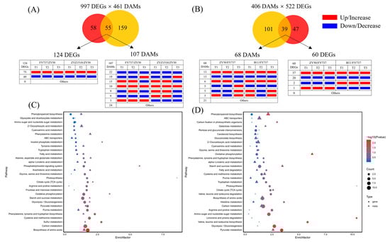KEGG interaction analysis of candidate late-seeding-response DEGs and DAMs. (A) Venn diagram of pathway numbers with candidate late-seeding-tolerant DEGs and DAMs involved and the expression pattern of DEGs and DAMs involved in 55 common pathways. (B) Venn diagram of pathway numbers with candidate late-seeding-sensitive DEGs and DAMs involved and the expression pattern of DEGs and DAMs involved in 39 common pathways. (C,D) represent pathway enrichment analysis bubble diagrams of the top 30 pathways that might have participated in late seeding response process. Red and yellow circles represent DEGs and DAMs, respectively. Numbers in circles-crossing area represent the count of KEGG pathways in which both DEGs and DAMs are involved. Red and blue rectangles represent up/increase and down/decrease, respectively.