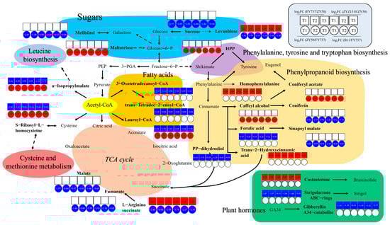 By sorting the metabolites with the same expression trends (increased/decreased in all groups) that were determined as key DAMs involved in late seeding response regulation from the 55 and 39 metabolic pathways, we doped out a possible late seeding response regulatory network involving sugars, phenylalanine tyrosine and tryptophan biosynthesis, phenylpropanoid biosynthesis, TCA cycle, fat acid metabolism and amino acid metabolism (Figure 8).