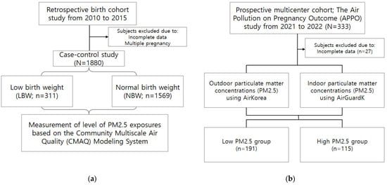 The first study was a hospital-based retrospective cohort study of 1880 pregnant women who delivered live babies between 2010 and 2015 at the Ewha Womans University Mokdong Hospital (EUMC 2020-07-043). We collected information on maternal age; body mass index (BMI); gestational age at birth (GAB); neonatal sex; weight and height at birth; appearance, pulse, grimace, activity, and respiration (APGAR) score; and place of residence at the time of delivery. The Air Korea database was used for PM2.5 exposure assessment, which includes hourly accumulated air pollution monitoring data for components such as sulfur dioxide, PM10, carbon monoxide, nitrogen dioxide, and ozone from the Ministry of Environment of Korea. The level of PM2.5 exposure was measured using the Community Multiscale Air Quality (CMAQ) modeling system. PM2.5, from CMAQ modeling data, was estimated using meteorological research and forecasting models comprising three overlapping weather data sources at 3, 9, and 27 km for a specific time period. PM2.5 exposure levels during pregnancy were determined based on residential address (city, county, and district, or si, gun, and gu in the Korean language). For each address, daily PM2.5 concentrations were matched to each individual according to their delivery date. Each individual’s outdoor air quality data were collected for each pregnancy trimester, extending to data from the week of delivery. PM2.5 data were collected from 2009 to 2015, depending on the pregnancy period of the study participants.