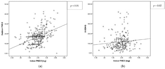 Correlation analysis between (a) indoor and outdoor PM2.5, and (b) indoor PM2.5 and 8-OHdG. 8-OHdG, 8-hydroxy-2-deoxyguanosine; PM2.5, particulate matter 2.5.
