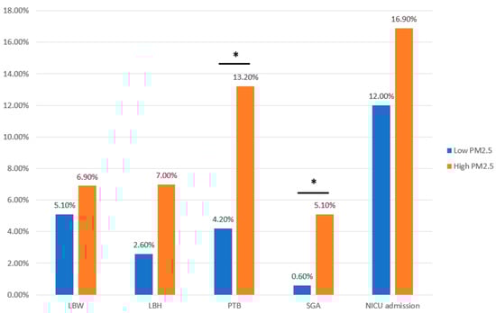 Pregnancy complications in the PM2.5 concentration group. LBW, low birth weight; LBH, low birth height; PTB, preterm birth; SGA, small for gestational age; NICU, neonatal intensive care unit. * p < 0.05 considered statistically significant.