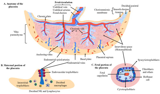Finally, in the cytoarchitecture of the placenta, we can distinguish the following parts. (1) In the chorionic villi, STBs are the main cells involved in the maternofetal exchange, whereas CTBs are involved in the regeneration of STBs and EVTs. Fixed and free connective tissue cells originating from the differentiation of mesenchymal cells can also be identified, such as endothelial cells, fibroblasts, myofibroblasts, smooth muscle cells, and macrophages—known as Hofbauer cells—which can also be recruited from maternal circulation [21]. Fetal vessels are equally recognized in the villous trees, comprising capillaries and sinusoids in the terminal villi; arteries, arterioles, veins, and venulas in the stem; and intermediate villi with lumens controlled in an autocrine and paracrine manner [24]. (2) In the maternal portion of the placenta, iEVTs and eEVTs are the identified trophoblastic cells, which are critical for the process of placentation and modulation of different populations of immune cells, mainly decidual natural killers (dNKs), decidual macrophages, and decidual T cells [25]. (3) Fibrinoids, extracellularly deposited materials distributed throughout the placental tissue, comprise two distinctive extracellular matrices: fibrin-type fibrinoids composed of fibrin and maternal blood-clot products that modulate the growth of villous trees and favor blood flow and matrix-type fibrinoids (a product secreted by EVTs that favors trophoblast invasion through specific interactions with cell-surface integrins) [26]. The structure and cells located in the placenta are summarized in Figure 1.