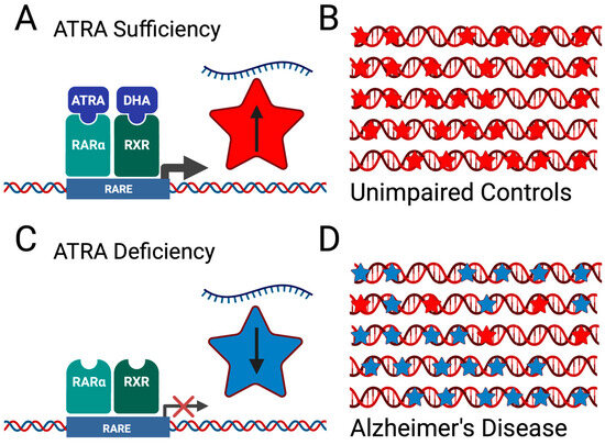 Theoretical detection of ATRA deficiency through gene expression analysis of human brain transcriptomics data. (A) Activation of RAR-RXR heterodimers induces increased transcription of genes that possess retinoic acid response elements (RAREs; red star). (B) In the case of ATRA sufficiency in unimpaired control brains, transcription is maintained across ATRA-sensitive genes (red stars). (C) Deficiency in ATRA leads to transcriptional repression of ATRA-sensitive genes (blue star). (D) In the case of ATRA deficiency in Alzheimer’s disease brains, transcription is decreased across ATRA-sensitive genes (blue stars).