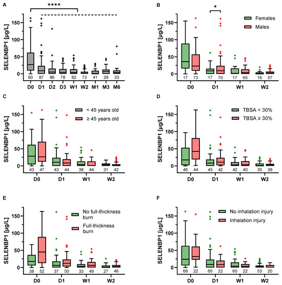 On admission, serum SELENBP1 was considerably elevated in burn patients with a median (IQR) concentration of 26.9 (10.0–61.0) µg/L. Within the first posttraumatic day, serum levels declined significantly to a median (IQR) of 9.0 (0–22.5) µg/L. Thereafter, SELENBP1 remained at low levels throughout the observation period (Figure 1A). Stratified analysis by baseline characteristics revealed non-significantly higher initial SELENBP1 levels in females (Figure 1B) and burn patients with a TBSA ≥ 30% (Figure 1D) and full-thickness burns (Figure 1E). No such associations were found for stratification by age (Figure 1C) or the presence of inhalation injury (Figure 1F).