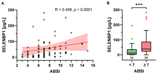 A moderate positive correlation was found between serum SELENBP1 levels on admission and the ABSI (R = 0.408; p < 0.0001) (Figure 2A). The median (IQR) baseline SELENBP1 concentration was 11.7 (1.3–34.9) µg/L and 38.9 (22.0–87.2) µg/L in burn patients with an ABSI < 7 (n = 34) and ≥ 7 (n = 56), respectively (p = 0.0002) (Figure 2B). Interestingly, a groupwise Spearman’s correlation between the baseline SELENBP1 concentration and the ABSI by clinical characteristics revealed stronger associations in less severely affected patients: R = 0.339 (p = 0.021) vs. R = 0.198 (p = 0.198) in patients with TBSA < 30% vs. ≥ 30%; R = 0.444 (p = 0.005) vs. R = 0.138 (p = 0.329) in patients without vs. with full-thickness burns; and R = 0.390 (p = 0.001) vs. R = 0.311 (p = 0.159) in patients without vs. with inhalation injury, respectively (not shown). Moreover, baseline SELENBP1 levels and the ABSI correlated more strongly in patients aged < 45 years than in patients aged ≥ 45 years: R = 0.584 (p < 0.0001) vs. R = 0.157 (p = 0.292), respectively. No significant difference was observed between men and women.