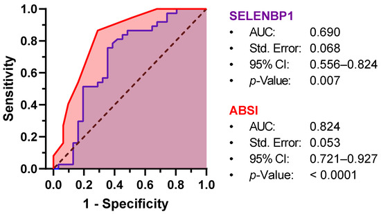 To assess the potential value of baseline SELENBP1 concentration and the ABSI as predictors of pulmonary infection risk in burn patients, an ROC analysis was conducted, with an estimated area under the ROC curve (AUC) of 0.69 for SELENBP1 and 0.82 for the ABSI (Figure 3). Baseline levels of serum SELENBP1 > 21.2 µg/L predicted the risk of pulmonary infection with a sensitivity of 75.7% and a specificity of 64.5%. The ABSI has proven to be a more accurate predictor, with a sensitivity of 86.5% and a specificity of 71.0% at a cut-off of 6.5 (Table 3). Multiple logistic regression confirmed both baseline SELENBP1 and the ABSI as predictors of pulmonary infection in burn patients (Table 4). Burn patients with an ABSI of 7 or higher had a 14.4-fold greater risk of pulmonary infection than patients with an ABSI equal to or less than 6 (OR, 14.37; 95% CI, 3.15–88.78; p = 0.001). Initial SELENBP1 levels > 21.2 µg/L were associated with a 2.5-fold greater risk of pulmonary infection, although this did not reach statistical significance (OR, 2.47; 95% CI, 0.68–8.88; p = 0.164).