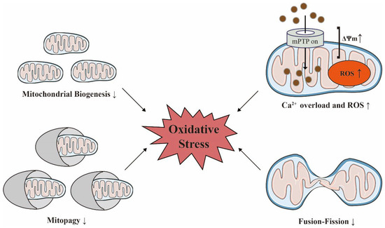 Mitochondrial homeostasis is decisive for maintaining oxidative stress with age. Acute injuries can trigger an increase in mitochondrial membrane potential (ΔΨm), calcium overload, and the overproduction of reactive oxygen species (ROS) in damaged mitochondria. The reduced functionality of biosynthesis, dynamics, and quality control in heart failure and chronic kidney disease can also exacerbate oxidative stress. The ↑ indicates an increase; the ↓ indicates a decrease. Adobe Illustrator (version 2021 25.0) was used for the production of this figure.