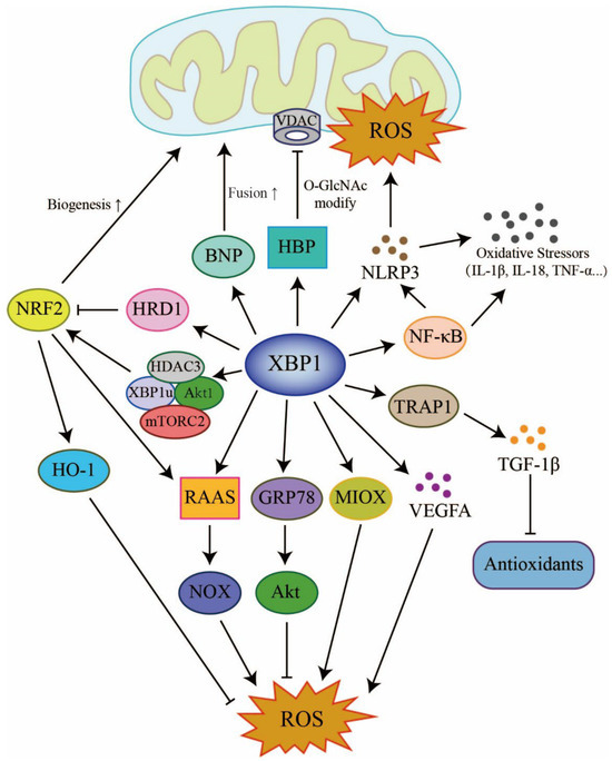 XBP1 orchestrates an intricate oxidative stress network via its role as a transcription factor and can control the expression of many molecules related to mitochondrial function and morphology, the immune system, the renin–angiotensin–aldosterone system (RAAS), and the antioxidant defense system. The ordinary arrow indicates the promotion; the T-shaped arrow indicates suppression. Adobe Illustrator (version 2021 25.0) was used for the production of this figure.