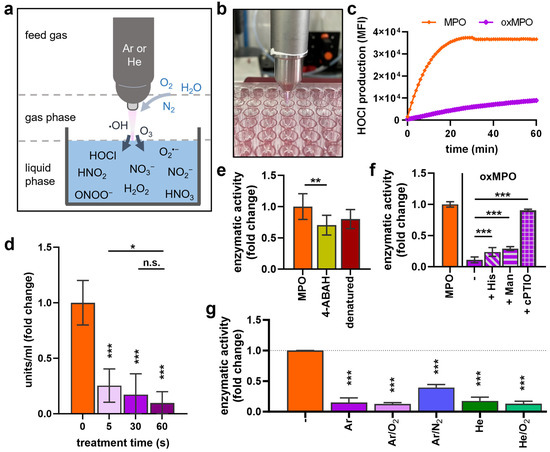 MPO activity decreased after plasma treatment. (a) Scheme of physical plasma technology ionizing feed gas and releasing reactive species in the gas phase that further react with a treated surface (here: liquid). (b) Image of argon plasma treatment of MPO (oxMPO) in PBS before (c) APF and H2O2 were added to measure HOCl production for 60 min due to MPO activation. (d) MPO exposure to different argon plasma treatment times and TMB-based MPO activity calculation. (e) MPO was treated with 4-Aminobenzoic acid hydrazide (ABAH, 100 µM final concentration) or incubated for 5 min at 70 °C (denaturation) before H2O2 was added, and HOCl was measured by APF assay. (f) Histidine (His, 20 mM), mannitol (Man, 100 mM), or cPTIO (2 mM) were added prior to plasma treatment, and MPO activity was measured via TMB assay. (g) MPO was exposed to different plasma gas conditions for 30 s, and enzymatic activity measurement via TMB and APF assays. Data (d–g) are mean ± SEM normalized to untreated control from two to three independent experiments with three to six replicates each. Statistical analysis was performed using Mann–Whitney test (n.s. = not significant, * p < 0.05, ** p < 0.01, *** p < 0.001).