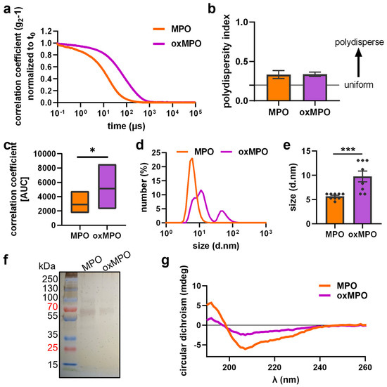 MPO structural changes were identified after plasma treatment. MPO was treated with argon plasma, and structural changes were measured. Dynamic light scattering revealed changes in (a,c) correlation coefficient, (b) polydispersity index, and (d) measured and (e) quantified size. SDS page (f), followed by silver staining, did not show oligomerization, and (g) shift in secondary structure was determined via circular dichroism spectroscopy. Data are shown as the mean of three experiments ± SEM. Statistical analysis was performed using T-test (* p < 0.05, *** p < 0.01).
