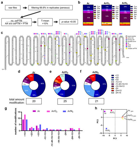 As previous studies revealed, protein-bound amino acids show dramatically different rate constants for chemical reactions with reactive species, yielding to a variety of oxPTMs types and their abundances [31,32]. MPO contains 745 amino acids, including 17 cysteines, 19 tyrosines, and 23 methionine, which represent preferred targets for oxidation. After plasma exposure and subsequent protease digestion, LC-MS/MS was performed to map the newly introduced oxPTMs (Figure 4a and Figure S2). The amino acids Cys, Met, Tyr, and Trp have been shown to exhibit different susceptibility to modifications by Ar and Ar/O2 plasmas [33], which is also reflected in the current data (Figure 4b). Figure 4c gives an overview on the observed oxPTMs in the amino acid sequence of MPO. Individual positions were marked in color for oxPTM that occur after treatment with Ar (purple), Ar/O2 (pink), or Ar/N2 (blue) plasmas. OxPTMs that occurred in multiple plasma conditions were highlighted in yellow and labeled separately.