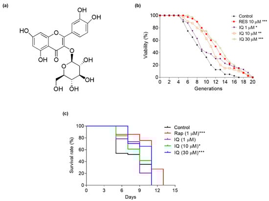 The chemical structure and antiaging effects of isoquercitrin (IQ) on yeasts. (a) The chemical structure of IQ. (b) Effect of IQ on the replicative lifespan of K6001 yeasts. Resveratrol (RES) at 10 μM was used as the positive control. (c) Effect of IQ on the chronological lifespan of YOM36 yeasts. Rapamycin at 1 μM was used as the positive control. *, **, and *** represent significant differences compared to the control group at p < 0.05, p < 0.01, and p < 0.001, respectively.