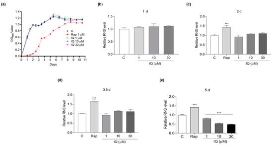 As shown in Figure 2b–d, the level of RNS in the growth phase was not affected after treatment with IQ compared with that of the control group. However, in the rapamycin-treated group, the RNS level was obviously increased at 2 d and 3.5 days. The IQ significantly reduced the RNS levels compared with the control group at 1 (p < 0.001), 10 (p < 0.001), and 30 μM (p < 0.001) at 5 days (Figure 2e). As a result of the inhibitory effect of rapamycin on the growth of yeasts, at the same time point, the influence on the RNS levels was different between the rapamycin and IQ due to the different growth phases (Figure 2e). These data indicated that the IQ decreased RNS in the early stationary phase during the chronological aging to extend the chronological lifespans of the yeasts.