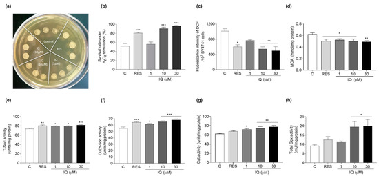 Oxidative stress is a key factor leading to aging and neurodegenerative diseases, and multiple natural products have significantly prolonged the lifespans of model organisms via antioxidative stress [6,26,27]. Therefore, the survival rate of the BY4741 yeast under H2O2 stimulation was examined to clarify whether antioxidative stress is involved in the antiaging mechanism of IQ. The results of the qualitative assay are shown in Figure 3a. The BY4741 yeasts that were treated with IQ at 10 and 30 μM grew better on a glucose agar plate containing 11 mM of H2O2 compared with the negative control. Moreover, the survival rate of the yeast under H2O2 stimulation after treatment with IQ was quantitatively confirmed on the glucose agar plate with or without 5.5 mM of H2O2. The survival rates of each group were as follows: 52.0 ± 5.6% for the negative control; 80.8 ± 1.5% (p < 0.001) for the RES-treated group at 10 μM; 56.1 ± 4.8%, 90.8 ± 2.9% (p < 0.001), and 96.8 ± 0.8% (p < 0.001) in the IQ-treated groups at 1, 10, and 30 μM, respectively (Figure 3b). These results implied that the beneficial effects of IQ on the yeast lifespan were preliminarily attributed to its antioxidative-stress activity.