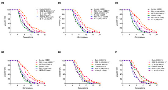 To further confirm the relationship between the antioxidant stress effect of IQ and its antiaging function, the Δsod1, Δsod2, Δcat, Δgpx, Δskn7, and Δuth1 of K6001 yeasts were employed in the replicative-lifespan assay. As Figure 5a–f display, the average generation of Δuth1 was longer than that of the K6001 wild type, whereas the average lifespans of Δsod1, Δsod2, Δcat, Δgpx, and Δskn7 were similar to that of the K6001 wild strain. Furthermore, IQ failed to prolong the average lifetimes of Δsod1, Δsod2, Δcat, Δgpx, Δskn7, and Δuth1 compared with the negative control. These results further confirmed that the SOD1, SOD2, CAT, GPx, SKN7, and UTH1 genes were involved in the lifetime prolongation effect of the IQ. The average replicative lifespans of the K6001 yeast and its mutants are shown in Supplementary Table S3.