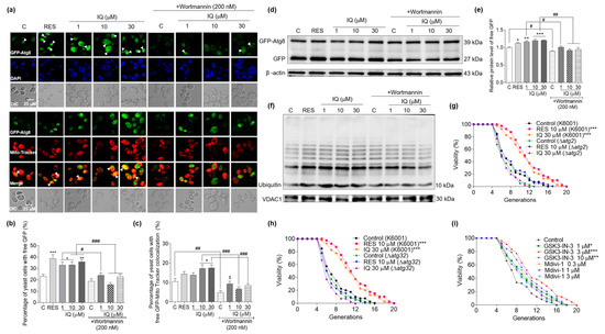 The ubiquitin proteasome system is crucial for controlling the degradation of organelles and proteins. Ubiquitin binds to damaged mitochondria and labels them as the substrates for mitophagy [33]. The expression levels of free GFP and ubiquitin at the protein level were analyzed via Western blot to further confirm the autophagy-induction effect of IQ. Figure 6d–f and Supplementary Figures S2 and S3 indicate that the IQ significantly increased the expression of free GFP at 1 (p < 0.01), 10 (p < 0.001), and 30 μM (p < 0.001). The increase in free GFP in the yeasts that were co-incubated with IQ at 10 and 30 μM was decreased by wortmannin (p < 0.01). Meanwhile, IQ could enhance the expression of ubiquitin, and the increase in ubiquitin via IQ decreased after treatment with wortmannin. Atg2 and Atg32 are critical to mediate the degradation of mitochondria via mitophagy [10]. Therefore, a replicative-lifespan assay of the Δatg2 and Δatg32 strains with the K6001 background was further conducted. As indicated in Figure 6g,h, the average generations of these two mutants failed to be extended after the IQ treatment, confirming that the ATG2 and ATG32 genes were involved in the mitophagy-induction effect of IQ. Furthermore, we used mitophagy inhibitor Mdivi-1 and activator GSK3-IN-3 to check the effect of mitophagy on the lifespan of the K6001 yeast. As expected, Mdivi-1 did not affect the replicative lifespan, and GSK3-IN-3 significantly increased the replicative lifespan of the K6001 yeast at doses of 1, 3, and 10 μM (Figure 6i and Supplementary Table S3, p < 0.05, p < 0.001, and p < 0.01, respectively). These data indicated that IQ could significantly induce autophagy and mitophagy to produce the antiaging effect in yeasts.