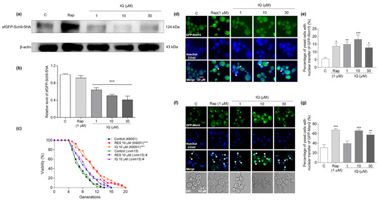 The results of the Western blot analysis indicated that IQ effectively inhibited the Sch9 at the protein level after 2 h of treatment at 1, 10, and 30 μM (p < 0.001); this result was better than rapamycin at 1 μM (Figure 7a,b and Supplementary Figure S4). This result revealed that IQ extended the lifespans of the yeasts by inhibiting the expression of Sch9 at the protein level. As Figure 7c indicates, the antiaging effect of IQ was significantly weakened in the Δrim15 of K6001, indicating that Rim15 played a key role in the lifespan extension effect of IQ. The average lifespans of K6001 and Δrim15 of K6001 are displayed in Supplementary Table S3. Subsequently, the intracellular localization of the GFP-Rim15 fusion protein after IQ treatment was examined. Figure 7d,e show that IQ significantly enhanced the nuclear transfer of GFP-Rim15 at 1 (p < 0.01), 10 (p < 0.001), and 30 μM (p < 0.05). These data indicated that Rim15 is involved in the antiaging effect of IQ. Moreover, IQ could effectively improve the gene expression of MSN2 at 10 μM (p < 0.01) and 30 μM (p < 0.01), as well as that of MSN4 at 10 μM (p < 0.01), after 24 h (Supplementary Figure S5). BY4741 yeasts containing the GFP-Msn2 plasmid were employed to observe the subcellular localization of Msn2. IQ obviously promoted the nuclear translocation of GFP-Msn2 at 10 μM (p < 0.001) and 30 μM (p < 0.01), as rapamycin did at 1 μM (p < 0.001) (Figure 7f,g). These results suggested that IQ promoted the nuclear transfer of GFP-Msn2 in the yeast, triggering the transduction of stress-resistance signaling.