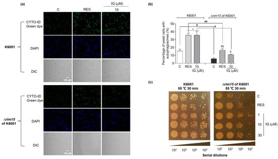 Rim15 is required for the induction of autophagy that occurs upon the inhibition of Sch9 [16]. Compared with the K6001 yeast, the rate of autophagosome formation in the negative control and RES- and IQ-treatment groups significantly decreased in the ∆rim15 of the K6001 yeasts at p < 0.05, p < 0.01, and p < 0.05 (Figure 8a,b). Rim15 is also involved in stress-resistance signals to appropriately induce a transcriptional program that increases survival in G0. The regulon downstream of RIM15 comprises classical anti-stress genes, such as MSN2 and MSN4 [15]. A qualitative anti-thermal-stress assay on ∆rim15 of the K6001 yeasts was conducted to investigate whether RIM15 is involved in the anti-stress effect exerted by IQ. The Δrim15 of the K6001 yeasts exhibited poor heat resistance. Compared with the K6001 yeasts, the anti-thermal-stress effect of the yeasts in the IQ-treated group was significantly weakened in the Δrim15 of the K6001 yeasts at 1 × 104 and 1 × 105 dilutions (Figure 8c). These results indicated that Rim15 plays an important role in the autophagy-induction and anti-thermal-stress effects of IQ.