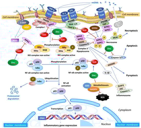 Zinc exerts an influence on the cellular redox status, mitigating oxidative stress and countering the activation of NF-κB signalling []. Given its importance for the function of various zinc finger proteins, some of which can interact with NF-κB, zinc can impact the activity and localization of NF-κB. Zinc fingers are autonomously folded domains structured around a zinc ion [] with roles in DNA recognition, RNA packaging, transcriptional activation, protein folding, assembly, and regulation of necroptosis []. Research indicates that zinc plays a regulatory role in NF-κB transcription, mediated by the zinc-finger protein TNF-α-induced protein 3 (TNFAIP3) and the receptor signalling pathway activated by peroxisome proliferator-activated receptor (PPAR) [,]. TNFAIP3, also known as A20, is a widely expressed cytoplasmic signalling protein known for its anti-inflammatory, NF-κB inhibitory, and anti-necroptotic properties. A20 comprehensively regulates ubiquitin-dependent signals and modulates the duration and intensity of signalling by various proteins involved in the NF-κB pathway [,,]. In TNF receptor (TNFR)- and toll-like receptor (TLR)-initiated pathways, TNFAIP3 serves as the primary negative regulator of NF-κB activation, impacting endothelial cell adhesion molecules and oxidative stress biomarkers []. Studies have shown that A20 functions as a negative regulator, maintaining the balance in the strength and duration of NF-κB activation by deubiquitinating receptor-interacting serine/threonine-protein kinase 1 (RIPK1) and TNF receptor-associated factor 2 (TRAF2), the components of the TNFR1 signalling complex (Figure 1). Moreover, A20’s deubiquitylase (DUB) activity restricts TRAF6-mediated and RIPK2-mediated activation of NF-κB during TLR/IL-1R and NOD signalling, respectively. In vitro, zinc upregulates the gene expression of A20 and peroxisome proliferator-activated receptor alpha (PPAR-α), both of which are zinc finger proteins with anti-inflammatory properties [].