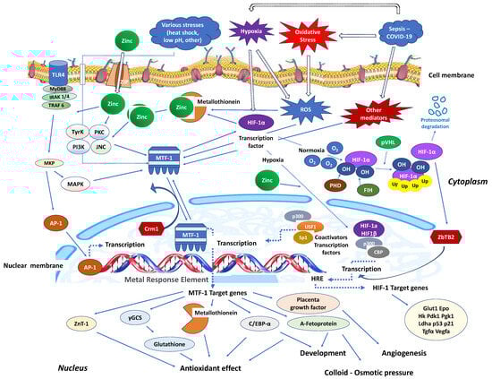 Critical zinc effects on transcriptional factors apart from NF-κB. MTF-1: Intracellular metal responsive transcription factor 1; HIF-1α: hypoxia-inducible factor 1-alpha; AP-1: activator protein-1; MRE: metal-response element; PHD: prolyl hydroxylase domain enzyme; FIH: factor-inhibiting HIF; Crm1: chromosomal maintenance 1; O2: oxygen molecule; HRE: hypoxia response element; p300: protein 300; CBP: CREB-binding protein; ZBTB2: zinc finger and bric-a-brac (BTB)-domain-containing protein 2; OH: hydroxyl group; Ub: ubiquitin; ZIP: Zinc importer protein; pVHL: von Hippel–Lindau protein, ROS: reactive oxygen species; MyD88: myeloid differentiation primary response 88; IRAK-4: interleukin-1 receptor-associated kinase 4; TLR: toll-like receptor; TRAF: TNF receptor-associated factor; MKP: MAP kinase phosphatases; MAKP: mitogen-activated protein kinase; USF1: upstream transcription factor 1; γGCS: γ-glutamylcysteine synthetase; Glut1: Glucose transporter 1; Hk: hexokinase; PdK1: pyruvate dehydrogenase kinase-1; PgK1: phosphoglycerate kinase-1; Ldha: lactate dehydrogenase A; Tgfa: transforming growth factor, alpha; Vegfa: vascular endothelial growth factor A; C/EBV-α: CCAAT/enhancer binding protein alpha.