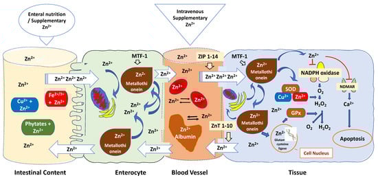 As shown in Figure 3, oral zinc bioavailability is affected by dietary chelating effects of phytates, iron, copper, fibre, and other factors in the small intestine, making oral zinc an unpredictable delivery method []. Specific transporters found in the apical membrane of enterocytes absorb zinc in the duodenum and the first part of the jejunum []. When it is absorbed, zinc is transported from the lumen into the enterocytes and released in a rate-limiting step into the portal blood, where it is predominantly bound to albumin, which distributes the metal in the body. Metallothionein controls zinc intestinal absorption whereas zinc regulates metallothionein gene expression []. Under conditions of oxidative stress, zinc is liberated from its complex with metallothionein and redistributed within cells to carry out antioxidant functions []. The zinc-dependent transcription factor MTF-1 is responsible for activating the expression of metallothionein genes, providing cellular protection against oxidative stress. MTF-1′s regulation is linked to the prevailing free zinc concentration in the cellular environment, where it acts as an intracellular zinc sensor, maintaining cytosolic free zinc ion levels at low picomolar to nanomolar concentrations []. However, due to the release of zinc from proteins and organelles, zinc concentrations can transiently and locally increase. This enables zinc to impact gene expression, enzymatic activity, and cell signalling []. It also plays a role in balancing the immune response, functioning as a “gatekeeper” []. Mitochondria, endoplasmic reticulum, and the Golgi apparatus sequester excess zinc to maintain a low steady-state level of free Zn2+ [].