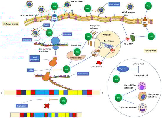 Recent studies have shown that 31% [] to 57.4% [] of COVID-19 patients have decreased zinc plasma concentrations compared to healthy controls (74.5 (53.4–94.6) μg/dL vs. 105.8 (95.65–120.90) μg/dL (p < 0.001) []. It has been suggested that the low zinc levels in COVID-19 patients may represent an acute phase reaction due to COVID-19 infection [,]. The cytokine storm redistributes zinc from the plasma into cells as a protective measure to prevent immune dysfunction, systemic inflammation, oxidative stress that can lead to DNA damage, and cell apoptosis []. Additionally, the observed low zinc levels may result from a combination of a pre-existing deficiency, altered protein binding, increased losses, heightened metabolic demand, and dilution secondary to fluid overload []. These low zinc levels also contribute to immune dysfunction, which, in turn, increases angiotensin-converting enzyme 2 (ACE2) activity, potentially facilitating binding with SARS-CoV-2. In vitro, it has been observed that the spike protein of the SARS-CoV-2 virus interacts with ACE2 and the serine protease transmembrane protease serine 2 (TMPRSS2) in the alveoli, allowing the virus to enter host cells. ACE2 is an enzyme that relies on zinc for its function and consists of two subdomains, I and II, specifically involved in zinc binding. Prior research has indicated that a decrease in zinc levels promotes the interaction between ACE2 and the spike protein of SARS-CoV-2 (Figure 4). The RNA synthesis of SARS-CoV-2 is catalysed by an RNA-dependent RNA polymerase (RdRp), a core enzyme within its multiprotein replication and transcription complex []. During the acute phase of COVID-19, the inhibitory effect of zinc on virus entry, fusion, RNA synthesis, replication, protein translation, and viral dissemination is compromised due to insufficiently low zinc levels [].