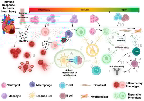 Overview of the immune response to ischemic heart injury (1) After acute MI, damage-associated molecular patterns (DAMPs) are released from the infarcted myocardium and initiate the immune response. (2) Neutrophils are rapidly recruited from the circulation, and upon arrival to the injured myocardium, polarize to an inflammatory phenotype, initiating the inflammatory phase (shown in red). (3) Inflammatory neutrophils release ROS, NETs, inflammatory cytokines/chemoattractants via degranulation, and begin clearing debris. (4) Recruited monocytes arrive at the site of injury and (5) differentiate into inflammatory macrophages, aiding in the clearance of debris and additional leukocyte recruitment via the production of inflammatory cytokines and chemokines. (6) Dendritic cells begin to activate the adaptive immune response by presenting antigens to lymphocytes in mediastinal lymph nodes. (7) The transition to resolution (shown in yellow), is promoted by macrophage efferocytosis of dying neutrophils, which initiates a phenotypic switch toward repair and resolution. (8) Treg release of anti-inflammatory signaling also facilitates resolution. (9) Further recruitment of neutrophils and macrophages now assume a reparative phenotype (shown in green), releasing anti-inflammatory/reparative mediators to further resolve inflammation, as well as pro-angiogenic and fibrotic factors to stimulate repair processes and scar stabilization. (10) Lymphoid cells infiltrate the injured myocardium and can contribute to fibroblast activation and scar formation. (11) The presentation of autoantigens to lymphocytes elicits an autoimmune response, delaying repair in the chronic phase of stable scar formation. Dysregulation of any phase of the immune response results in defective scar formation and impaired cardiac function. Importantly, this sequence of events is accelerated in reperfused MI (I/R) compared to non-reperfused MI.