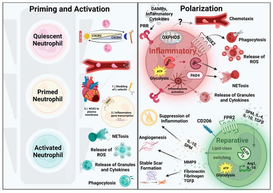 Neutrophil activation and polarization in myocardial I/R injury. Priming and activation: Under homeostatic conditions, quiescent neutrophils are released from the bone marrow into circulation and return to the bone marrow via reciprocal expression of CXCR2 and CXCR4, respectively, under circadian control. During injury, DAMPs prime neutrophils is in circulation, resulting in (1) the shedding of L-selectin, (2) the movement of NOX2 and integrins to the plasma membrane, and (3) the upregulation of inflammatory gene expression. At the site of injury, fully activated neutrophils elicit effector functions, including the release of ROS, NETs, granules/cytokines, and phagocytosis of pathogens, or in the case of I/R, cellular debris. Polarization: During I/R, DAMPs activate PRRs and promote neutrophil polarization toward an inflammatory phenotype. PRR signaling stimulates activation of the inflammasome and release of granules and inflammatory cytokines. Myeloperoxidase (MPO) is also activated, which in turn upregulates NOX2 and NE function, increasing ROS generation both within phagosomes and extracellularly. NE and PAD4 mediate the formation and release of neutrophil extracellular traps (NETs), which contribute to microvascular dysfunction during reperfusion (“no reflow”). During resolution, SPMs and anti-inflammatory cytokines signal through pro-resolution receptors (e.g., FPR2), to upregulate ALOX15 and facilitate a phenotypic switch toward repair. Reparative neutrophils undergo lipid class switching, increase expression of CD206, Arg1, and release resolving factors (e.g., IL-10), pro-angiogenic factors (e.g., MMP9), and profibrotic factors (e.g., TGFβ) that contribute to the resolution of inflammation and wound healing. Metabolically, neutrophils rely on glycolysis for most effector functions, but may require oxidative phosphorylation (OXPHOS) for proper chemotaxis.
