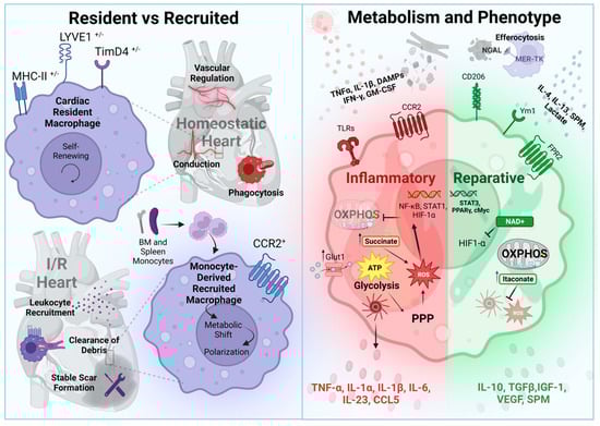 Macrophage regulation and function during myocardial I/R injury. Resident versus recruited: In the developing and homeostatic heart, self-renewing resident macrophages (CCR2-) contribute to the formation and maintenance of the vasculature, electrical conduction, and phagocytosis of dysfunctional organelles in the myocardium. These macrophages can be subclassified by the expression of MHCII, LYVE1, and TimD4 on their cell surface. In response to injury, monocyte-derived macrophages (CCR2+) are recruited to the heart, where they further leukocyte infiltration during inflammation, clear dead cells and debris, and modulate stable scar formation during repair. Polarization and metabolism: DAMPs and inflammatory cytokines polarize recruited monocytes into inflammatory macrophages through activation of PRRs (e.g., TLR2/4). Upregulation of inflammatory genes (HIF-1α) and glucose transporters (Glut1) enhance glycolysis and suppress oxidative phosphorylation (OXPHOS). This results in the accumulation of succinate and activation of the pentose phosphate pathway (PPP), increasing ROS production. Activation of the inflammasome releases inflammatory and chemoattractant molecules, furthering inflammation. MerTK-mediated efferocytosis of dead cells, including neutrophils containing NGAL, as well as the binding of anti-inflammatory cytokines, initiates a phenotypic switch in the macrophage toward reparative function. Enhanced OXPHOS and the subsequent increase in itaconate and NAD+ suppresses inflammatory gene expression (HIF-1α) and effector functions (ROS, inflammasome). Reparative macrophages express more CD206, YM-1, and FRP2, and release mediators that contribute to revascularization and stable scar formation.