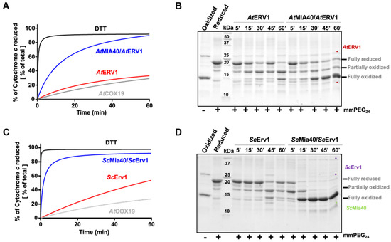 In vitro oxidation of Arabidopsis COX19 protein using the ERV1–MIA40 couple from Arabidopsis thaliana or Saccharomyces cerevisiae. Capacity of ERV1 alone or in the presence of MIA40 to oxidize Arabidopsis COX19 using A. thaliana (A,B) or S. cerevisiae (C,D) proteins. In (A,C), the electron transfer from reduced COX19 (40 µM, grey line) was followed by recording the reduction of 20 µM cytochrome c at 550 nm over time in the presence of 4 µM ERV1 alone (red line) or with 4 µM MIA40 (blue line). A reference was made using 40 µM DTT as an electron donor (black line). In (B,D), COX19 (40 µM) oxidation was followed over time using cysteine alkylation using mmPEG24 and SDS-PAGE separation after incubation with 4 µM ERV1 alone or in the presence of 4 µM MIA40.