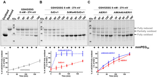 The impact of glutathione on AtCOX19 oxidation was thus examined over a longer period, typically 3 h, to reach equilibrium, using a concentration of 8 mM and a GSH/GSSG ratio corresponding to a redox potential of −274 mV at pH 7.4. The timeframe and redox potential of the glutathione were chosen based on previous studies (see above) and were somehow imposed by the presence of 0.25% GSSG in freshly prepared GSH solutions. At these values, a significant oxidation of AtCOX19 occurred when only glutathione was present, with the fully oxidized form representing ca 40% of the total AtCOX19 at the end of this experiment (Figure 2A). Hence, the low amounts of GSSG and/or the combination of GSH and O2 was, to some extent, sufficient to introduce both disulfides in AtCOX19. Then, the impact of this GSH/GSSG buffering solution was assayed in the presence of the yeast (Figure 2B) and Arabidopsis (Figure 2C) MIA40–ERV1 couples. ScErv1 was unable to oxidize AtCOX19 in the presence of glutathione and the reaction still required ScMia40 (around 90% of AtCOX19 oxidation after 30 min, as observed in Figure 1). On the contrary, AtERV1 was able to oxidize AtCOX19 in the presence of glutathione (80% of oxidized AtCOX19 after 3 h) and the reaction was not improved by the presence of AtMIA40 (Figure 2C). Overall, unlike yeast proteins, there is a clear effect of GSH on Arabidopsis MIA40–ERV1 oxidizing properties, with GSH or GSSG supporting ERV1 oxidase activity and maybe counteracting MIA40 activity. In this respect, it would also be informative to measure the redox potential of the MIA40 catalytic disulfide. By comparing it with the one of glutathione in the IMS of plant mitochondria, it may help to determine to which extent MIA40 is oxidized in plant cells. A recent study concluded that the in vivo redox state of Mia40 at steady-state in yeast cells is about 70% oxidized and that it is influenced both by Erv1 and glutathione [47].