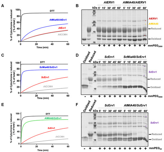 In vitro oxidation of Arabidopsis CCMH using the ERV1–MIA40 couple from Arabidopsis thaliana or Saccharomyces cerevisiae. Capacity of A. thaliana (A,B) or S. cerevisiae (C,D) ERV1–MIA40 couples to oxidize Arabidopsis CCMH using cysteine alkylation with mPEG2000 or mmPEG24 (as indicated) and SDS-PAGE separation or cytochrome c reduction. In all of these assays, 40 µM CCMH was incubated with 4 µM ERV1 alone or in presence of 4 µM MIA40. In (E,F), the same tests were performed using a hybrid system comprising S. cerevisiae Erv1 and A. thaliana MIA40.